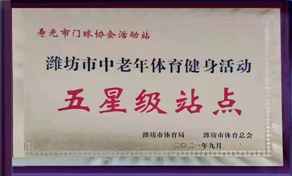 寿光市门球协会活动站被潍坊市体育局、潍坊市体育总会授予“潍坊市中老年体育健身活动五星级站点”称号。