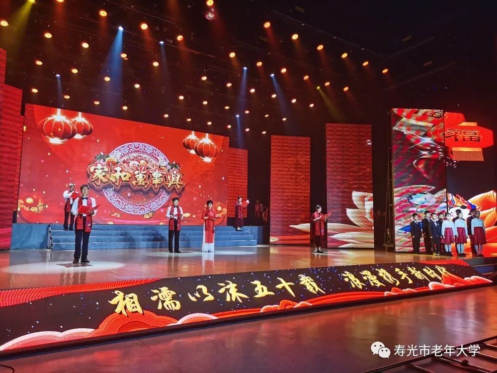 寿光市老年大学主持与普通话班的朗诵《家和万事兴》、声乐班的合唱《少年》参演了此次盛典,声乐老师刘志涛老师也深情演唱了一首《母亲》,共同祝愿金婚夫妇幸福万年长。