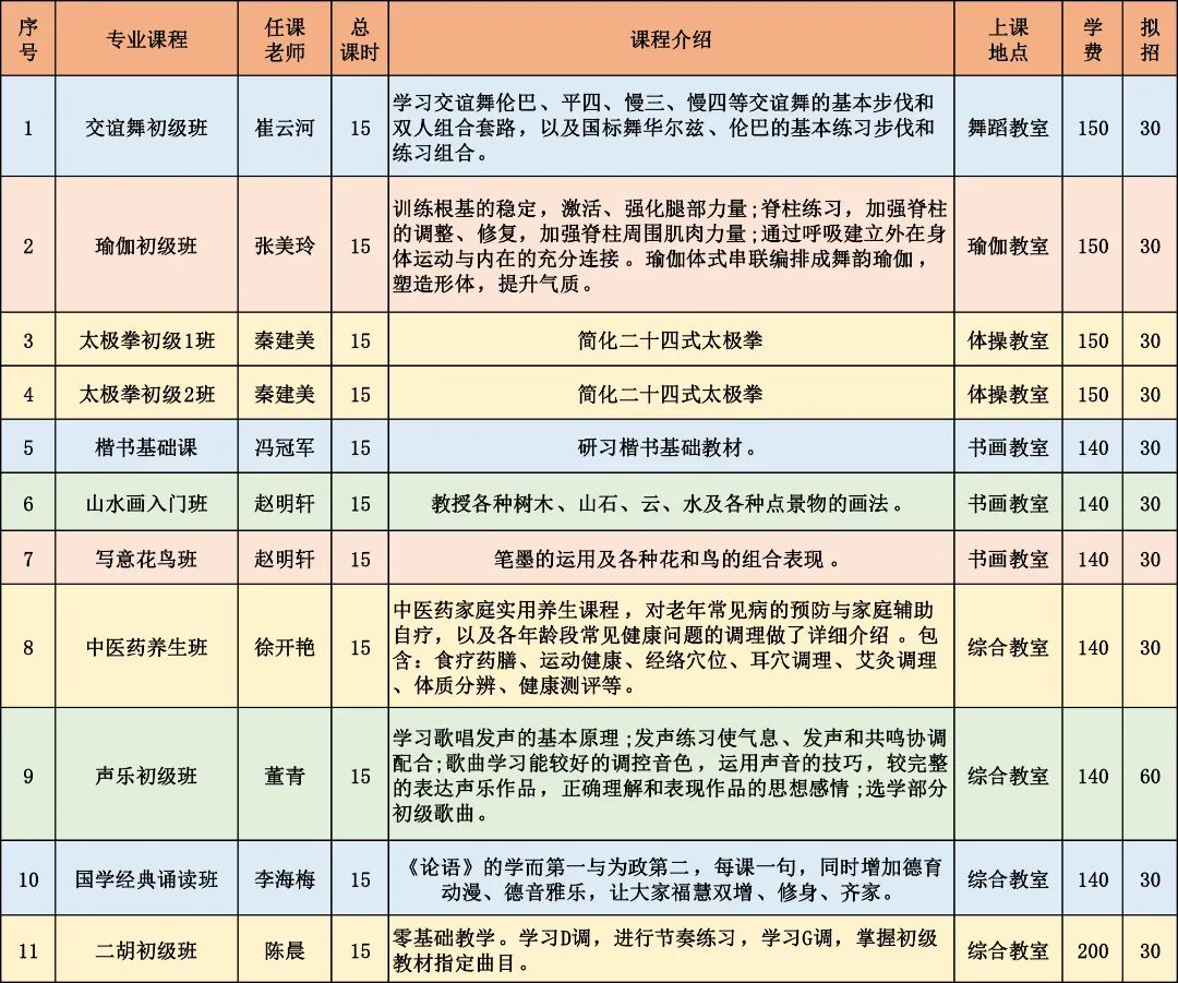 2023年春季班幸福老年大学预设课程:书画系:楷书基础班、山水画入门班、写意花鸟班 音乐系:声乐初级班、二胡初级班 舞蹈系:瑜伽初级班、交谊舞初级班 综合系:太极拳初级班、中医药养生班、国学经典诵读班。