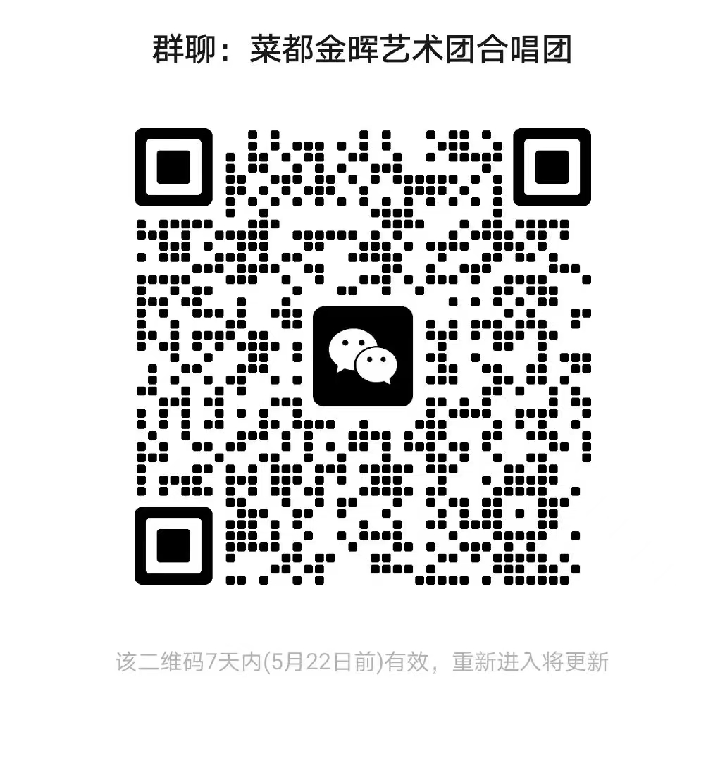 公示时间为3个工作日,如有异议请于3个工作日内到活动科办公室(中心校区三楼B3015室)查询反映。以上入围人员公示期满无异议即为合唱团团员,请于5月19日——5月22日扫描菜都金晖艺术团合唱团二维码入群,加入群后请修改群昵称为真实姓名。