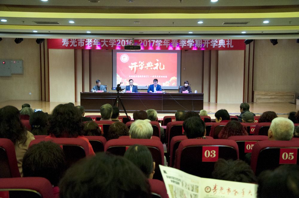 市委组织部副部长、老干部局局长葛树涛在讲话中指出,2016年在市委、市政府的重视支持和社会各界的关心帮助下,全体师生员工群策群力,创新实干,办学条件、办学规模、办学水平都实现了大跨越,在我市老年教育发展史上写下了浓墨重彩的一笔。总投资2亿元,面积18000多平方米老年大学新校投入使用,学习活动场所扩大了10倍,硬件设施发生翻天覆地的变化,达到了全国一流,全省县级最好;招生人数翻了两番,达1500多人次;师资力量空前壮大,一批政治素质高、专业能力强、德高望重、年富力强的优秀教师不断加入,教学质量不断提高;社会影响力大大提升,成功举办了潍坊市老年大学校长培训班,省委老干部局副局长兼山东老年大学校长杜英杰亲临授课并为我们新校揭牌;文化养老取得丰硕成果,晚霞老干部艺术团被授予“山东省优秀老干部文艺团队”,庆祝建党95周年老干部诗词书画展、首届校园文化艺术节、全市老干部迎春联欢会等文化活动在丰富老干部精神文化生活的同时,也为全市文化和品质寿光建设做出了突出贡献。去年,市委老干部局被评为“全市文化建设先进单位”。2017年我们的主要任务是进一步规范教学管理,拓展办学思路,提升办学质量和办学水平,努力把老年大学、老干部活动中心建设成全市老干部党建中心、老干部培训中心、老干部人才中心、老干部活动中心和老干部志愿服务中心, “五个中心聚集区”,全力打造老年朋友的学习乐园,快乐家园,和谐校园。