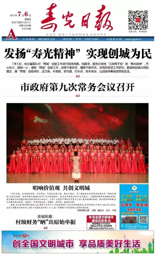 寿光市老年大学积极参与全市文明城市创建,老年大学两支合唱队演唱曲目在“唱响价值观 共创文明城”合唱比赛中均取得了优异成绩,合唱一队进行了汇报演出。合唱队的队员都是来自各个岗位的退休干部,年龄最大的82岁,他们虽然不是专业歌手,但大家团结一心,在几位老师的带领下,顶着烈日到排练场练习,一步步提高演唱水平,最终赢得了专业评委的肯定。