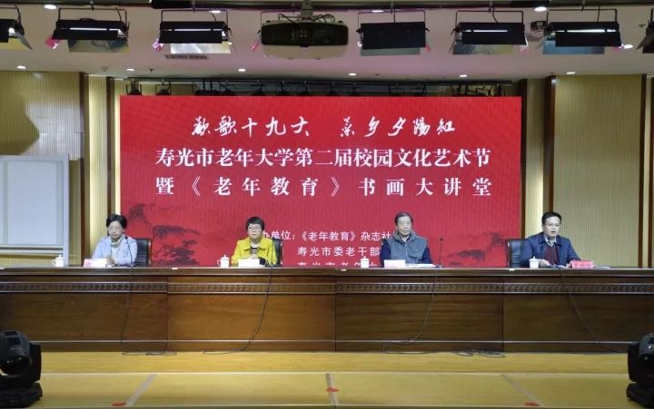 为深入学习贯彻党的十九大精神,全面展示我市老年大学教学成果,进一步推动我市老年教育的发展,12月11日开始,寿光市老年大学第二届校园文化艺术节暨《老年教育》书画大讲堂隆重举行。本次活动由《老年教育》杂志社、寿光市委老干部局、寿光市老年大学主办。《老年教育》杂志社副总编辑魏春玲、《老年教育》杂志社综合部主任徐臻、《老年教育?书画艺术》编辑李兰祥;济南大学教授、《老年教育?书画艺术》特邀书画专家滕西奇;潍坊市老干部活动中心主任、老年大学副校长高霞;寿光市委组织部副部长、老干部局局长葛树涛出席开幕式。