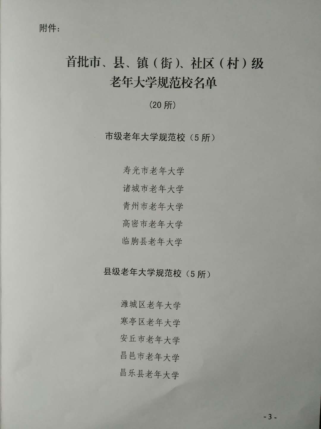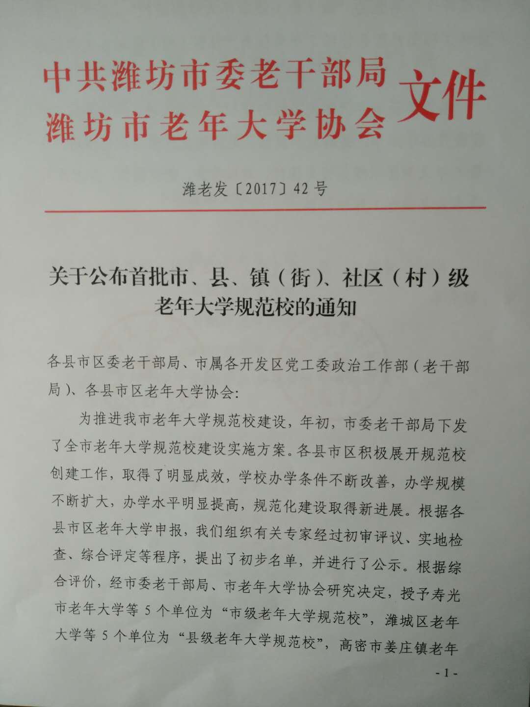 寿光市老年大学按照潍坊市“市级老年大学规范校”创建实施方案要求,把2017年定为“规范提升年”,从办学条件、党建工作、教学管理、办学效果等方面全面规范提升。经积极申报和现场考核,寿光市老年大学被授予“潍坊市级老年大学规范校”,寿光市老年大学屯田社区分校被授予“潍坊社区(村)级老年大学规范校”。