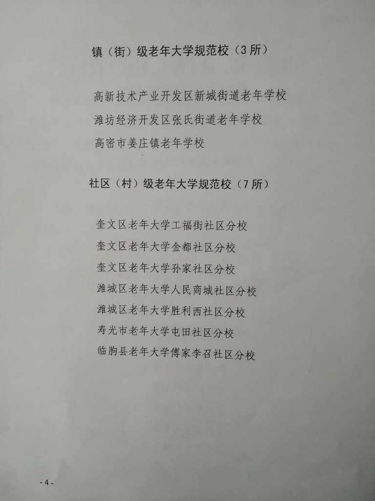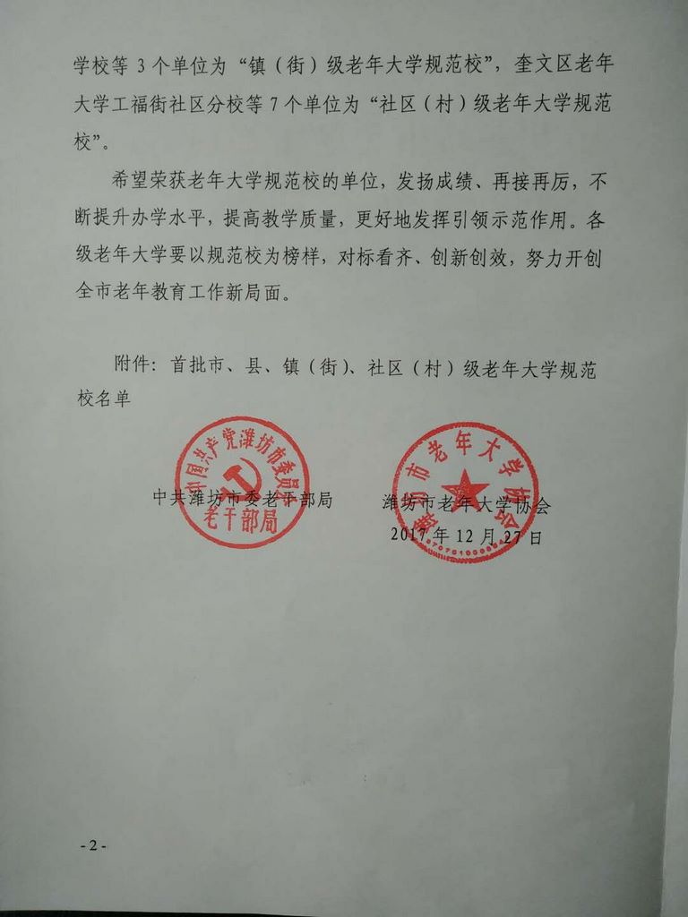 寿光市老年大学按照潍坊市“市级老年大学规范校”创建实施方案要求,把2017年定为“规范提升年”,从办学条件、党建工作、教学管理、办学效果等方面全面规范提升。经积极申报和现场考核,寿光市老年大学被授予“潍坊市级老年大学规范校”,寿光市老年大学屯田社区分校被授予“潍坊社区(村)级老年大学规范校”。