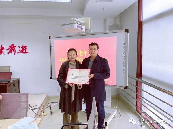 王效金校长简要介绍了2021学年寿光市老年大学干部队伍建设、庆祝建党百年主题系列活动、离退休干部服务管理等工作开展情况,从“云课堂+线下课堂”双模式有序复学、推进“家门口”老年大学建设、教学理论研究成果等多角度全面总结一年来教学重点、亮点工作,并为在2021年第二届全省老年大学精品课程推广与观摩活动、“摩罗丹”第三届山东省老年大学文艺展演活动中获奖的志愿服务教师颁发荣誉证书。