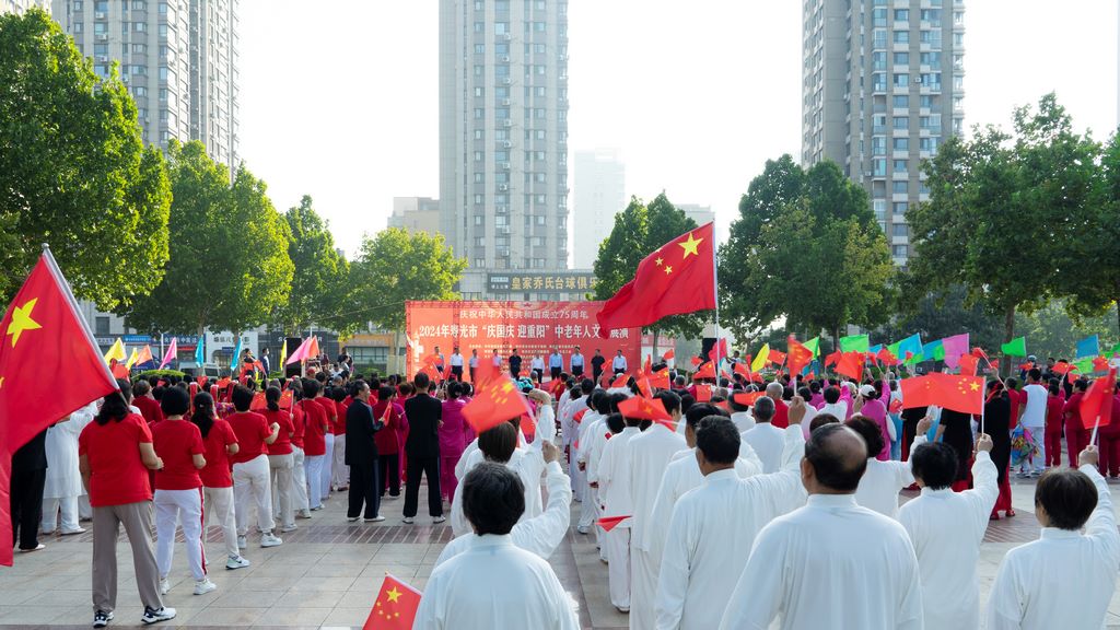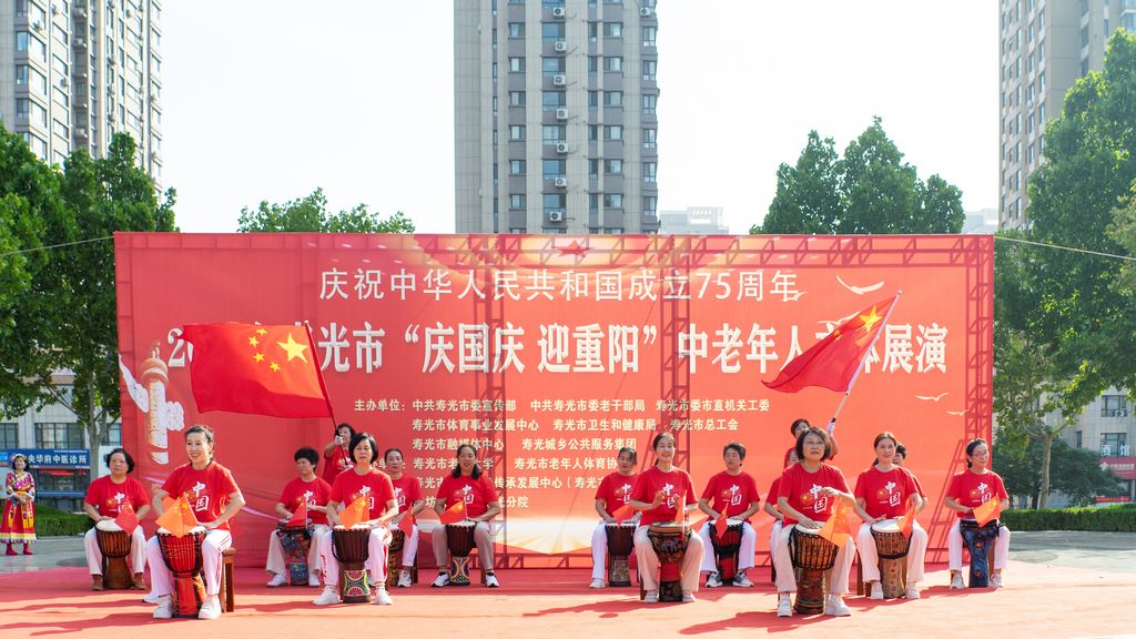 为庆祝中华人民共和国成立75周年,喜迎重阳佳节,9月29日,由中共寿光市委宣传部、市委老干部局、市直机关工委、市体育事业发展中心、卫生和健康局、总工会、融媒体中心、城乡公共服务集团主办,寿光市老年大学、老年人体育协会、京剧艺术传承发展中心承办,潍坊眼科医院寿光分院协办的2024年寿光市“庆国庆·迎重阳”中老年人文体展演庆祝活动在人民广场举办,来自全市18支队伍近千名老年人参加