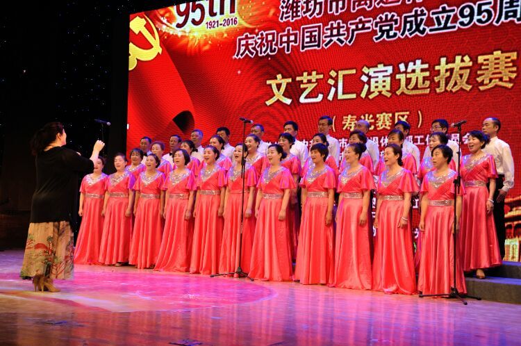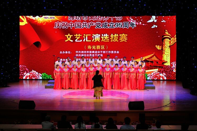 为庆祝中国共产党成立95周年,展现全市广大离退休干部积极向上的精神风貌,搭建县市区老干部文化交流平台,中共潍坊市委老干部局、潍坊市老干部活动中心、潍坊市老年大学、潍坊市舞蹈家协会等单位联合举办全市离退休干部庆祝中国共产党成立95周年文艺汇演。5月24日,在寿光市文化中心音乐厅举行青州、临朐、寿光三个县市参演节目选拔活动。共演出合唱、舞蹈、器乐等八个节目。